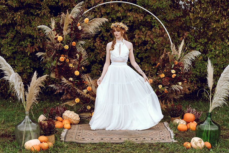 Une création de robe de mariées unique pour un mariage boho sur des superposition de tapis, parmi les fleurs et feuille séchées. La robe de Lola est une robe crop top bohème, en mousseline de soie et dentelle de calais et celle de Marine est une robe de cérémonie de mariage en satin fluide reprenant les même code de forme que celle de Lola pour un mariage assorti, bohème et gipsy a souhait.