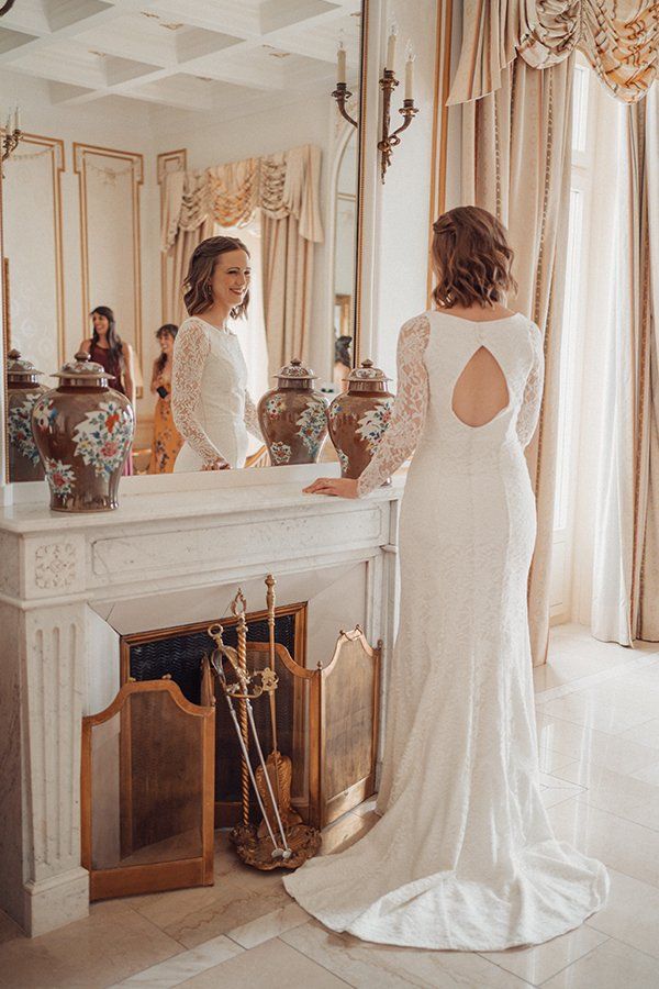 Dos nu, dentelle, romantique. Cette robe de créatrice a été crée sur-mesure avec une traine et des boutons à l'arrière.