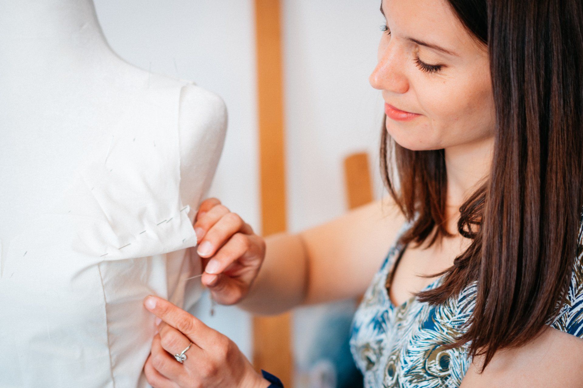 Une fois le modèle de la robe déterminé, je prends vos mesures et réalise un patron, suivi d'une toile que nous allons encore ajuster lors d'un essayage pour parfaitement l'adapter à votre corps.