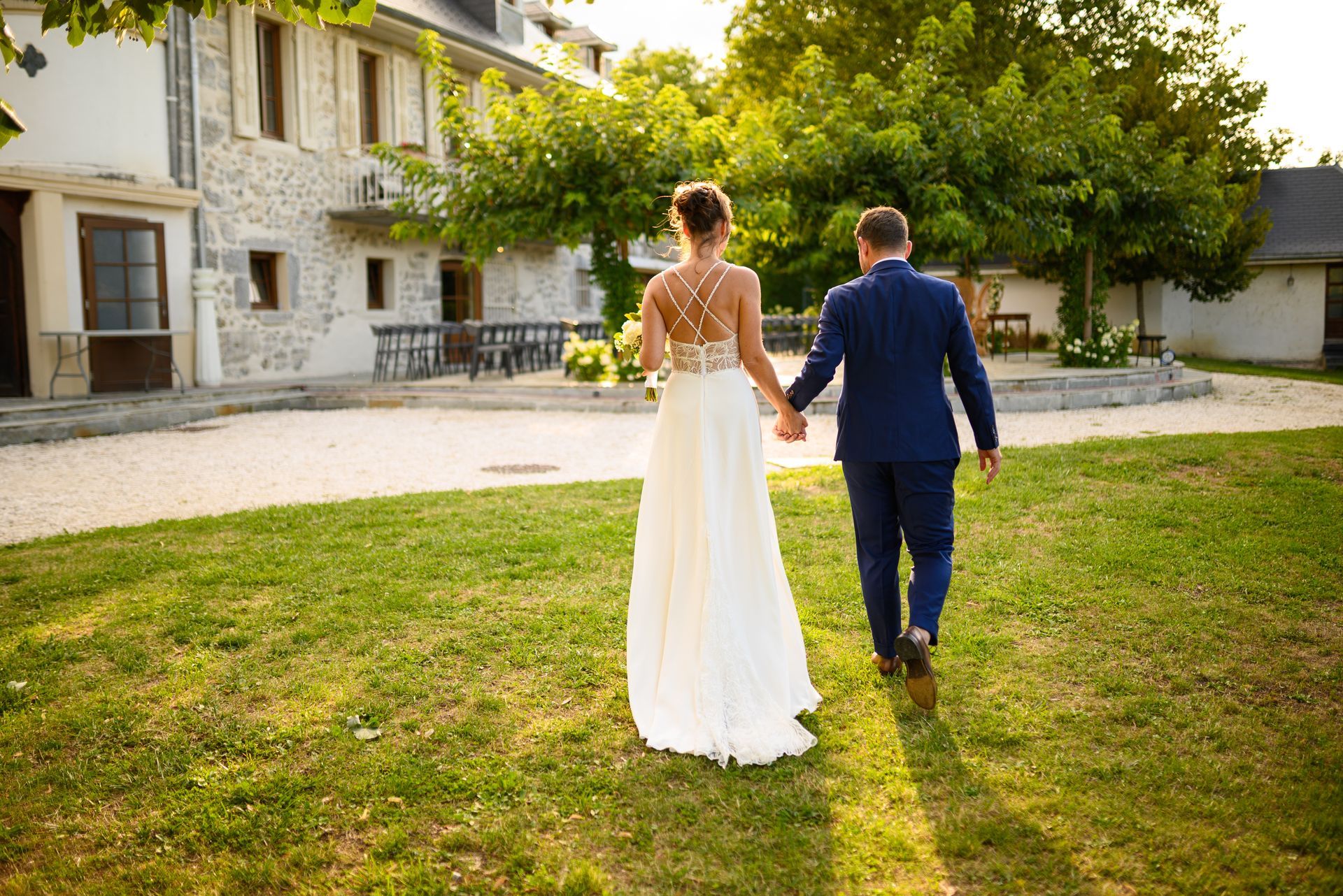 La robe de mariée de Lucie a pris forme au fil des échanges, des essayages et des gestes patients de l’atelier. Confectionnée en double crêpe de soie, elle enveloppe la silhouette avec douceur et naturel. Un insert de dentelle en transparence à la taille laisse deviner la peau, et le grand dos nu, traversé de bretelles perlées croisées, attire le regard avec délicatesse et caractère.
